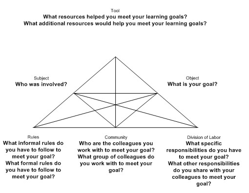 - Yamagata-Lynch, L. C., Click, A., & Smaldino, S. E. (2013). Activity systems as a framework for scaffolding participant reflections about distance education in an online instructional technology course. Reflective Practice, 14(4), 536–555. doi:10.1080/14623943.2013.809336